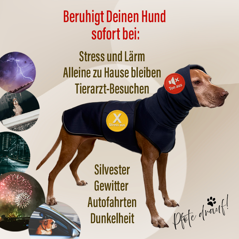 Der Wuff-Angst Mantel wurde zur Entspannung von Hunden entwickelt. Dies kann er über die Kompressionsfunktion leisten und über den Schallschutzschal.
